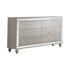 Jaws will drop at the sight of this glam and gorgeous three-piece bedroom set, featuring a platform bed, nightstand, and chest. The arched headboard makes a miraculous display with its LED light-up feature, crystal-like trim and vertical faux leather tufting. Find extra storage space on the footboard with two drawers and clear bar pulls. A matching five-drawer chest and two-drawer nightstand complements the bed, featuring the same sparkling trim and two drawers each.