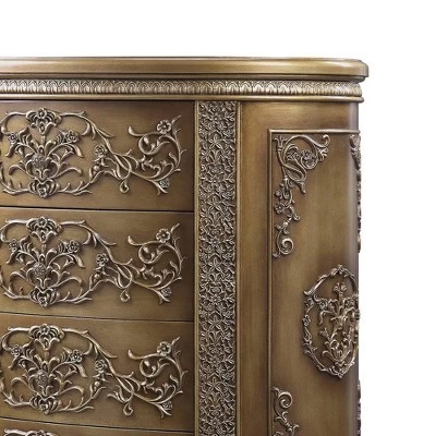 The grand Baroque style of the Constantine collection is sure to impress. With a beautiful bronze finish to emphasize the scrollwork and regal aspects of the collection. The bed features intricately carved embellishments and an oversized PU padded headboard, it is sure to be the focal point of your bedroom. The matching case goods provide style and plenty of storage with their ample drawers. Transform your bedroom into a glamorous boudoir with the Constantine collection.