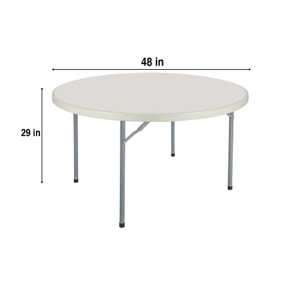 Our round BT Series blow-molded plastic folding tables are the perfect solution for banquet and cafeteria use. Suitable for indoor or outdoor in any application that calls for affordable, lightweight, weather-resistant and highly durable folding tables. Their lightly textured design keeps them scratch-resistant yet still enables a surface smooth enough for writing. The plastic tabletop is heat-resistant up to 212º F and designed with a non-bowing eggshell structure for fortification so it can hold up to 700 lbs. of distributed weight (1000 lbs. on BT-60R)! The tabletop color is a light speckled gray matching the textured gray powder-coated 19-gauge steel frame (17 gauge on BT-60R). Our straight-style legs and gravity slide locks maintain the table’s overall strength and support and provide ample leg room for users.