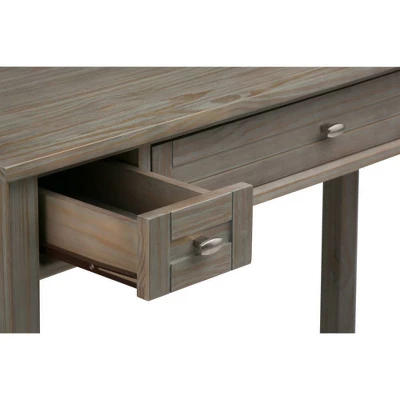 Norfolk Solid Wood Rustic 48 inch Wide Writing Office Desk. Style features shaker style drawers, oblong knobs, square tapered legs and square edged table top. Two side storage drawers with metal drawer glides. Handcrafted with care using the finest quality solid wood. Efforts are made to reproduce accurate colors, variations in color may occur due to computer monitor and photography. The product is warranted to be free from defects in material and workmanship for a period of (1) year from the date of purchase to the original owner.
