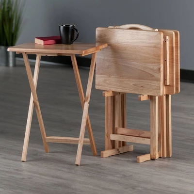 Whether it’s movie night or after-school snack time, you’ll love this Alex Five-Piece Snack Table Set from Winsome. Made from wood for classic style and dependability, this rectangle snack table set features four snack tables built with foldable X-shaped frames and rectangle tabletops. An included wooden storage rack makes it easy to tuck this snack table set into your closet or spare room whenever you don’t need it – when you do need it, simply unfold the tables and get ready for convenient snacking.