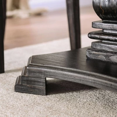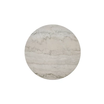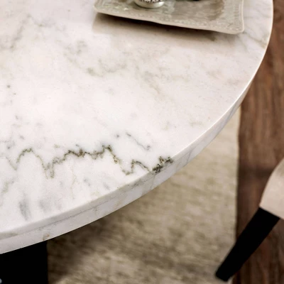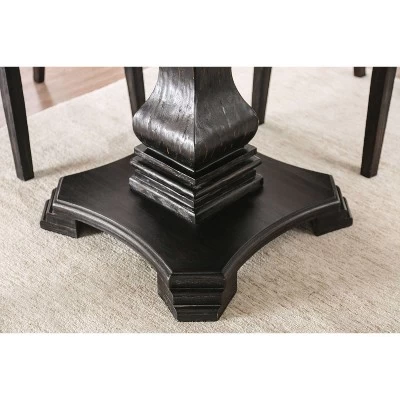 Bringing earthy elements into a sophisticated design, this five-piece dining table set is perfect for a refined breakfast nook or elegant dining room. The table is a true showstopper with a genuine white marble round resting atop a carved pedestal base in a rich antique black finish that delivers beautiful depth and contrast. Four chairs complete the set with plush seating featuring rolled and button tufted backs with gorgeous fabric upholstery to create comfort and sophistication.