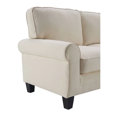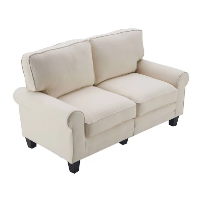 - Rolled arms, plush cushions and soft fabric create a cozy, contemporary style that completes any home decor