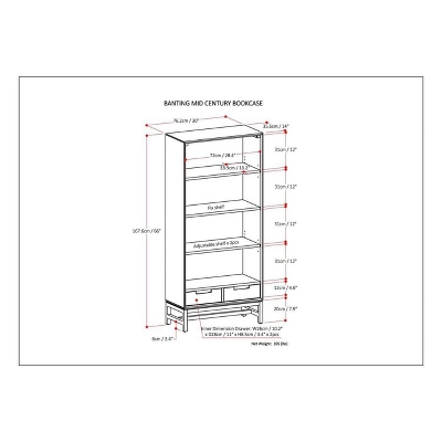 The Devlin Collection is made from richly-grained solid Rubberwood stained in a deep walnut brown finish. This mid-century modern industrial collection has a clean angular metal base, with square, simple modern drawer and table top. With no visible hardware, and only simple wood pull handles, the solid Rubberwood top, is simple and uncomplex. The Devlin Bookcase has two adjustable shelves and one fixed shelf with 2 small drawers for maximum functionality. The 30″ width x 14″ depth make this beautiful bookstand usable in your home office, living room, basement or den. The Devlin collection includes coffee, console, end tables, tv stands, sideboard buffet, desks and bookcase.