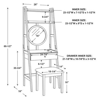 Start your day in style with this multipurpose leaning vanity set. A round 16” mirror is at the center of the sprawling 68.5” high ladder frame, made of solid wood and finished in warm white paint. The 15” x 25” tabletop offers ample space to work on a laptop or to do your makeup, while two upper shelves provide extra storage and display space. The drawer slides open on metal glides to reveal additional storage, and the matching vanity bench with beige upholstery offers a comfortable and convenient seat. Place this multi-functional piece against a wall in your bedroom, bathroom, or entryway.