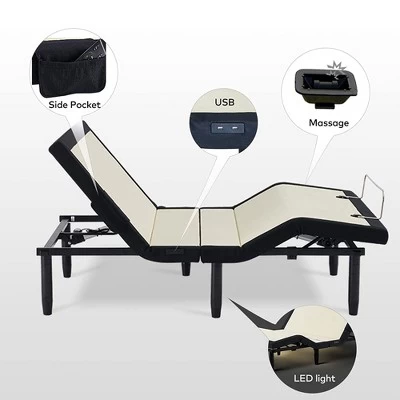 Upgrade your bed and find the perfect position for a great night’s sleep with the Applied Sleep Queen-Size Adjustable Bed Frame with Massage Zones and Bluetooth Control.This modern adjustable bed frame with a sleek design and premium features is a stylish addition to any bedroom. This adjustable frame features integrated back and legs massagers with 3 intensity levels that offer everything you could need for a perfectly restful night’s sleep. Including 4 USB ports for easy and hassle-free charging of devices with USB-compatible chargers, you can keep your favorite devices close at hand and ready to use.Decked out with features to make your life easier, this bed frame is fully controllable via the included wireless remote or by App on your own device. Independently adjust the head of the frame from 0-60 degrees and the foot from 0-40 degrees for unmatched personal comfort. Including an under-bed light and side pocket, this frame provides the ultimate comfort and ease. The preset zero-gravity, anti-snore, and memory positions make it easy to hop in bed and get cozy straight away.Enjoy a better night’s sleep with the Applied Sleep Queen-Size Adjustable Bed Frame with Massage Zones and Bluetooth Control.