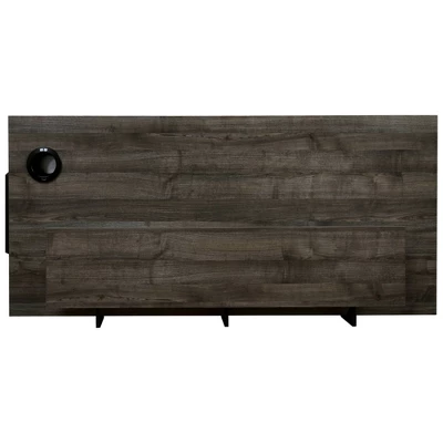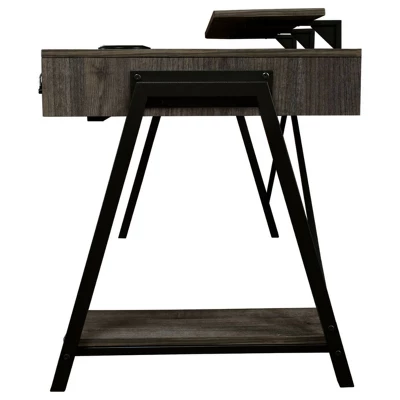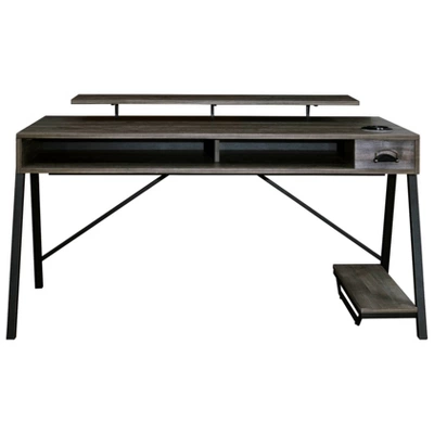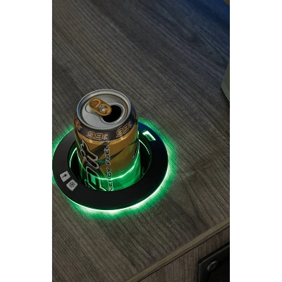 Elevate your style and up your game with the ultra-cool Barolli gaming desk. Clean and contemporary, this mixed media designer desk includes a metal frame in silvertone finish, topped with an engineered wood surface with replicated wood grain. Setting you up for success: a large open raceway for power cord management, desk top monitor shelf and an LED back light with multiple color options for an enhanced gaming experience. Along with a PC stand for easy access, this gaming desk features a custom designed headset hanger and a built-in electric can cooler with USB plug-in. Signature Design by Ashley is a registered trademark of Ashley Furniture Industries, Inc. ​