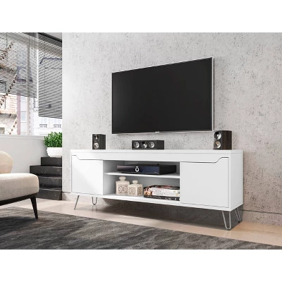 Finish off your space with the TV stand Mid Century Modern fans will appreciate and create the perfect living room entertainment mainstay for loved ones. Two center rectangular shelves store all your media accessories and essentials, while two concealed storage compartments keep things like books, magazines, or DVDs safely stashed away. With its clean lines, splayed metal feet, and sleek design, this piece will impress all your guests and become your best purchase.