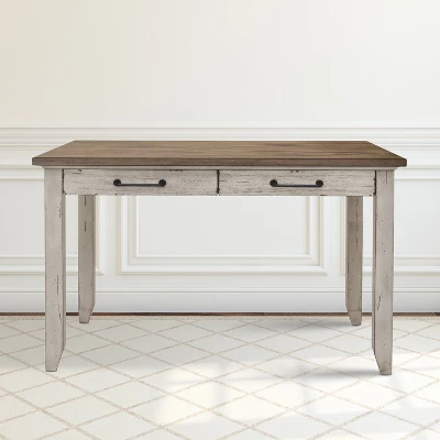 Perfect for your farmhouse inspired home, Bear Creek tables offer just the right mix of casual and rustic inspired designs to blend with today’s decorating environments. Finished in rustic ivory with a honey finished top, this sofa table features heavy distressing and rub through for a rustic casual look that will enhance any style. Tapered legs and two drawers with antique pewter drawer pulls for convenient storage.