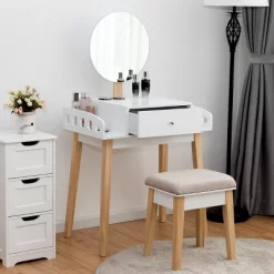 Costway Wooden Vanity Makeup Dressing Table Stool Round W/Drawer