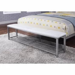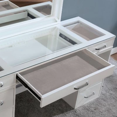 A mix of traditional stylishness and modern amenities come together in this contemporary vanity table set that features table, mirror, and cozy seat. Crafted in a chic luminous white finish, it features a large mirror with LED lighting for modern glitz, an 8mm tempered glass top providing plenty of space, with six drawers and an open shelf for even more storage space. The padded stool with back is the final piece of this charming set that’s perfect for a bedroom or sitting room.