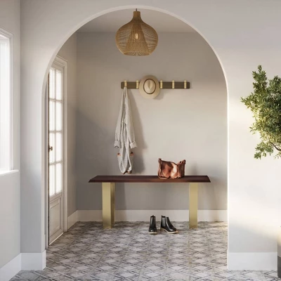 Get inspired by the Chapman Bench. This versatile bench is all about style and pairing mixed materials, a contemporary frame in gold powder coated iron with a solid Acacia wood seat. The clean lines and slim profile of the Chapman Bench make a space-efficient statement in your entryway, living room or at the foot of your bed.