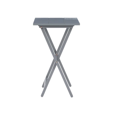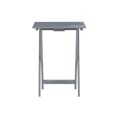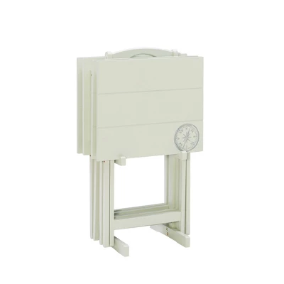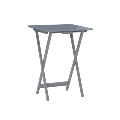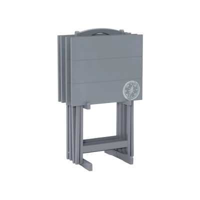 The TV Tray Table Set has a distinctive look with its sturdy wood construction and planked top. The compass designed top adds modern appeal to the set, which includes four foldable TV trays and one storage stand. The handle on the top of the stand makes it easy to transport the entire set from one room to another. A classic home furnishings staple.