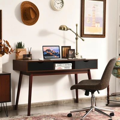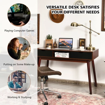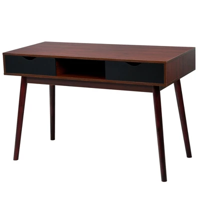 Our solid wood writing desk is designed in a simple but graceful style and will add charm to your room. It provides you with large workspace that satisfies your daily working or studying needs. Also, there are 2 drawers and one open shelf to help you keep everything tidy. Combining good appearance and practical functions, the desk well fits your requirements and can play different roles in the study room, bedroom, workshop and office. With sturdy construction, the computer desk is sure to have a steady performance and give you years of company.