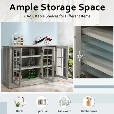 - Ample Storage Space: Featuring 55” x 16” spacious countertop and enclosed cabinets, our sideboard provides ample storage space for plenty of stuff, meeting your daily storage needs. You can store your spice jars, tablewares, kitchenwares, wine bottles, collectibles, etc. Besides, 4 adjustable shelves can well fit items of different heights.