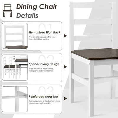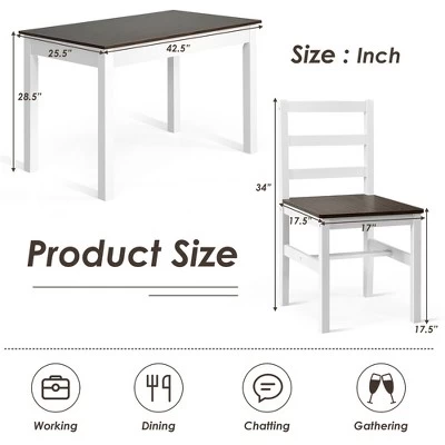 Our 5-piece dining table and chairs will bring your family and friends a perfect dining time. The 100% pine wood table legs and chair legs will provide 110 lbs of table support and 220 lbs of per chair support. Meanwhile, each chair is designed with crossbars to maximize stability. The high back of the chair aims to support the back and relieve fatigue. After use, the chair can be placed under the table to save space. The smooth surface of the table not only avoids scratches but also facilitates cleaning. The clean lines and stylish design are suitable for use in any restaurant or kitchen.
