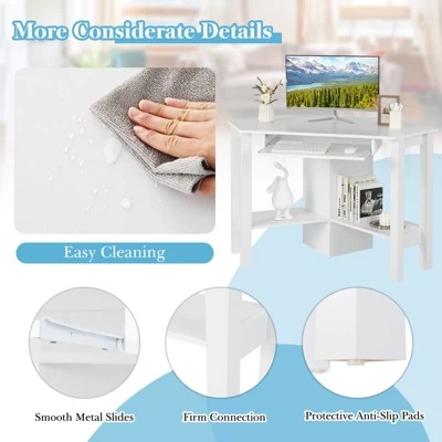 This is our new corner computer desk which is a compact and functional item. Be made of wood ,it is sturdy and durable . Corner design help you maximize your limited floor area. It has a large opening drawer to store your keyboard, And two opening storage space underneath for host computer , miniprinter, books ,CDs and so on. Can be used as study desk, office desk, home office desk workstation and computer desk. This desk compliments any room and is a great addition to any home office