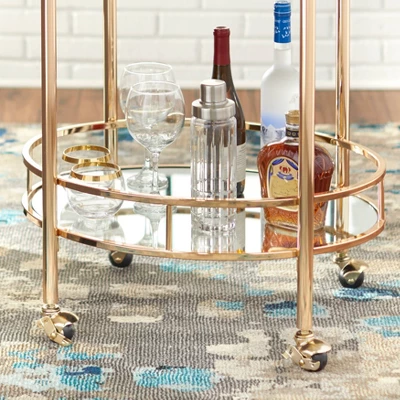 The Devin Oval Bar Cart from Lifestorey makes entertaining easier than ever. Crafted with a metal frame in a unique oval shape, the two shelves provide ample space for serving drinks, storing cocktail glasses, and more. The raised railing secures bottles and glassware while the caster wheels allow for easy mobility moving from room to room. Finished in a stunning bright gold-tone.