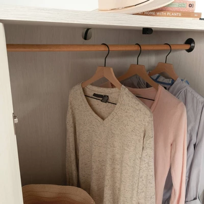 collection offers an abundance of storage with elegant style. Behind its two large doors, this armoire furniture features a hidden storage area that provides you with room for all your outfit essentials. This armoire wardrobe includes a garment rod so you can conveniently hang and organize apparel like blouses, slacks, and your favorite dresses, keeping them pressed and looking like new. With an adjustable shelf, you can customize your wardrobe to fit any shaped item. This armoire cabinet also features a lower drawer that opens and closes on smooth metal runners for easy access of items like shoes, spare blankets, stacks of sweatshirts and more. Add an armoire closet like this to the bedroom, hallway, entryway, or guest room for a touch of style and an extra storage solution. Finished in Glacier Oak , this versatile armoire is the answer to all your bedroom furniture storage needs.