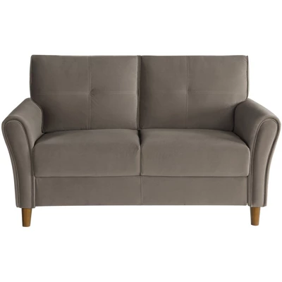 With a tailored look that is achieved with flared arms, clean lines, and a brown velvet cover, the love seat of the Dunleith Collection provides bold accent and soft touch to your living room’s dĂ©cor. The modern profile of the seating group supports plush seatbacks that are fronted with stich-tufting each design element lending to your ultimate comfort.Features : Finish: Walnut and BrownMaterials: Plywood, Pine Wood, FoamUpholstery: 100% PolyesterFabric Type: VelvetCushion Type: Coil Insert/ InnerspringFabric Care: Upholstery (S)Style: Modern & ContemporarySolid wood and plywood frameHigh-density foam padding over pocket coilsVelvet fabric upholsteryLoose back and attached seat cushionsExposed wood feet with walnut finishRemovable back cushion covers with zipperTufted detailAssembly requiredSpecifications : Product Dimensions : 34.5″ H x 57″ W x 33″ DProduct Weight : 71.75 lbsSeat Dimensions : 19″ H x 45″ W x 22″ DArm Height : 24.5″Product Dimensions : (Doorway Width) 20″Weight Capacity : (Per Seat) 300 lbs