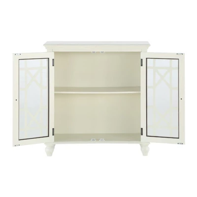 The addition of functional storage space to any home is always welcome. The Eliza Collection provides classic accent to your home’s décor while meeting your storage needs. The modern traditional design of the cabinet features behind door shelving, turned support feet, white finish, interwoven decorative mixed media glass and wood doors, and antiqued brass hardware. Also available in black and gray finish.Features : Made of wood and engineered woodAntique white finish2 cabinet doors with glass inlays1 interior shelfAntique brass tone mock key knobs with back plateNo assembly requiredSpecifications : Product Dimensions : 36.00″ H x 34.00″ W x 14.50″ DShelf Dimensions : 28.5×12.5×14.25 (2)Product Weight : 72 lbs