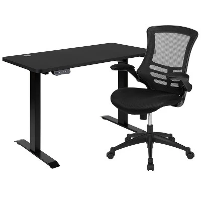 Improve productivity while also improving your mood with an adjustable computer standing desk. Whether in the office or working from home we spend a lot of time at our computer desk and a sit to stand desk offers a well-rounded design to get you through your work day. Designed for comfort the desk chair with wheels has breathable material and an ergonomic contoured seat. Transition from sitting to standing with the smooth motor mechanism. There’s no work involved with this electric height adjustable desk, simply push the up and down arrow buttons. Four preset memory buttons allow you to save your favorite settings whether you share the desk or are the sole user. The large work surface includes a grommet hole to neatly feed all cords through. The mid-back office chair includes built-in lumbar support to alleviate back strain while the waterfall front edge removes pressure from your lower legs. Achieve a healthier work habit with a standing and sitting desk to promote healthy blood flow while burning additional calories. Get the added comfort while standing with our sit or stand anti-fatigue mat with floor protection. Additional Features: Ergonomic Rolling Mesh Desk Chair: 24.5″W x 25.5″D x 37.5-41.25″H, Mid-Back Design with breathable mesh material and lumbar support, Tilt Lock Mechanism rocks/tilts the chair and locks in an upright position, Tilt Tension Adjustment Knob adjusts the chair’s backward tilt resistance, Contoured Mesh Upholstered Seat with CAL 117 Fire Retardant Foam