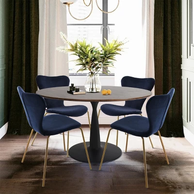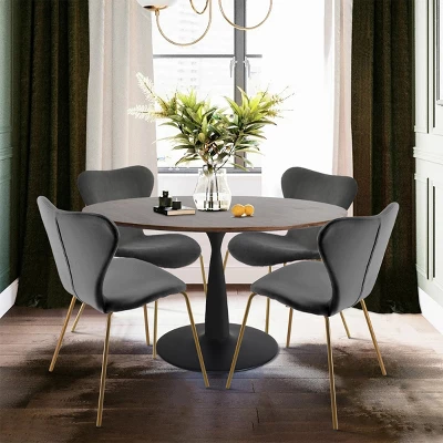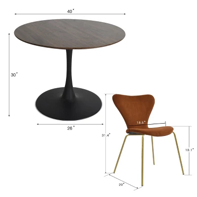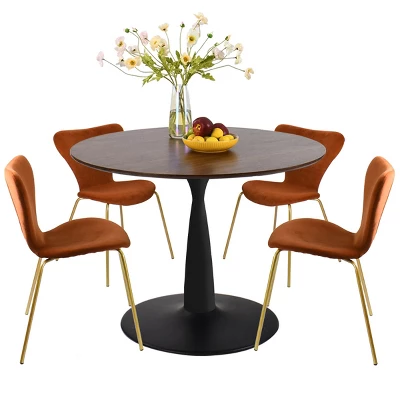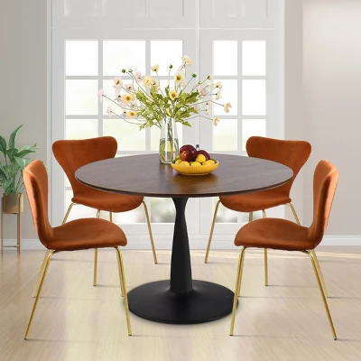 The Pop Maison modern dining table combined with sturdy metal pedestal base with high-grade manufactured wood, rich walnut foil, this finish gives this table natural warmth and texture, while the rounded heavy duty metal base comes in matt black offers a substantial foundation. The pedestal support base, not only beautiful but much more stable, were especially treated to be anti-rust and heavy-duty. Modern Ergonomic chair with fresh color and velvet backrest. It applies high-quality materials: breathable velvet, padded foam, adding to the aesthetic value of the design as well as ensuring the stability of the chair.It can hold a person who weighs up to 250 pounds.