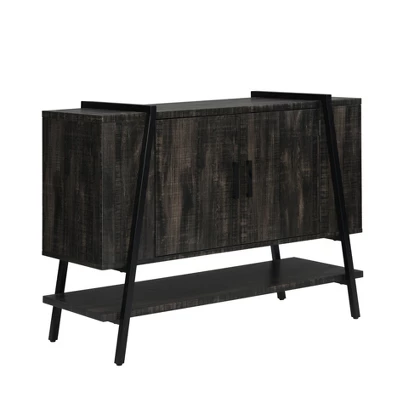 Complete your home decor with this stylish mid-century Server Cabinet with Charcoal Distressed Finish. This unit have metal decorative legs and double wood doors with knobs on each door, allowing easy access for entry. Inside the server there is a middle divider and a shelf for any other items you need to store. There is an open full-length wood shelf at the bottom of this unit. On top of the server you can showcase any beverage bottle or your favorite decor. There are endless possibilities with this unit to maximize your current space, regardless of its size. The mid-century server with a charcoal distressed finish gives ample storage while simultaneously keeping everything contained and out of sight.