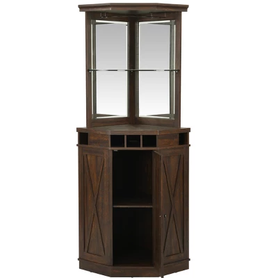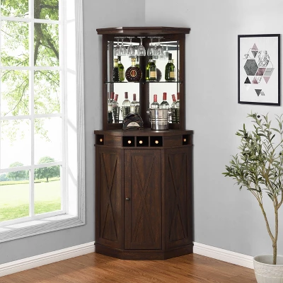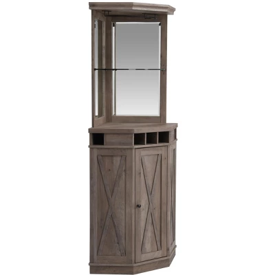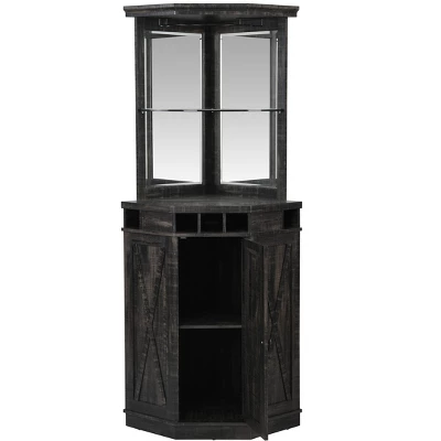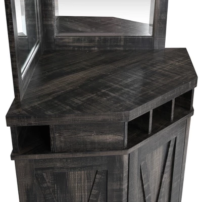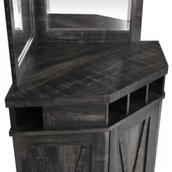 Your next get-together is going to be made even better with this corner bar unit. It’s an all-inclusive corner bar unit in a Charcoal finished hardwood frame. You won’t have to worry about where your stemware is going to go with the wrack on the top of this unit. Reflective mirrored panels are set behind the shelf. You can set more glasses or other accoutrements. The middle counter space is perfect for bottles or more wine glasses. The base of this unit features two wood doors with barn look and two shelves for any other items you need to store. Make this your one stop shop for setting up hor’dourves plates and serving drinks. Store bottles in the wine middle wine rack that can house five bottles.