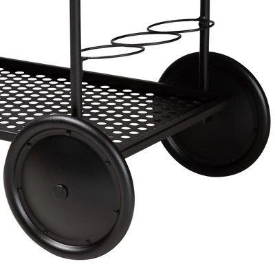 Efficient with a modernized personality, the Huntley wine cart makes hosting a breeze. Made in China, this versatile piece consists of a solid metal frame fitted with wood shelves. Three open shelves create a superb storage and serving station while three bottle holders accommodate select pieces of your collection. The Huntley requires assembly and features industrial-style wheels for easy mobility as needed. Adaptable for any occasion, the Huntley wine cart is sure to be a welcomed addition to any enthusiast. Overall Dimensions: 18.00″ W x 32.00″ D x 31.75″ H; Top Shelf: 16.00″ W x 30.00″ D x 2.88″ H; Middle Shelf: 14.50″ W x 24.38″ D x 7.75″ H; Bottom Shelf: 14.50″ W x 30.33″ D x 14.25″ H; Legs: 5.75″ H;