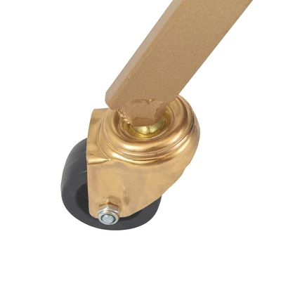 An ideal blend of style and function, this multi-purpose serving cart is great for everyday kitchen use or while entertaining. Rolling wheels and two bronzed handles make it easy to move the party from the kitchen to the living room, and casters lock in place for extra stability. Warm gold metal and light walnut wood color are a fun and stylish addition to your home. Enjoy the timeless charm of the architectural frame, constructed with sturdy iron to support two solid wood shelves. Perfectly sized to display your favorite decor and accessories.
