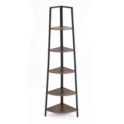 Add some charm and a mix of industrial-farmhouse when displaying your favorite decor with the 5 Shelf Corner Etagere Ladder Bookcase for Corner Space from JOMEED.The industrial bookshelf combines artistic elements and practicalitywith an open design that becomes the ideal platform for displaying decorations such as books, family photos, potted plants, utensils, and many other items. It compliments any living room, bedroom, kitchen, study, and office.The 5-tier corner bookshelf is made of high-grade MDF board and durable black metal providing stability for the corner bookcase and comes with a safety wall bracket to prevent the unexpected tipping of furniture. The bookshelf also features a supporting leg under the bottom shelf to provide stability and make it not easy to shake. This corner stand is suitable for any corner with its arc design, and no sharp edges, easily bringing the room together. Cut the clutter in your living room, office, or den with this 5-tier corner bookcase from JOMEED.