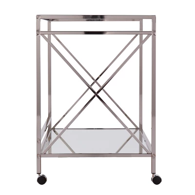 Keep the party rolling with the Aiden Lane Lexi Bar Cart. Sleek surfaces provide plenty of room to store glassware and spirits or to mix up the perfect dinner party cocktail, while locking caster wheels let you serve up drinks and appetizers from any room in your home. Tuck this two-tier bar cart in your den as a coffee bar or cocktail station, or wheel throughout your open concept space to top off refreshments. Entertain in style when you bring home this modern bar cart with storage.