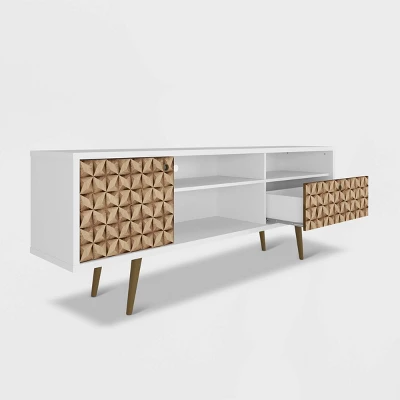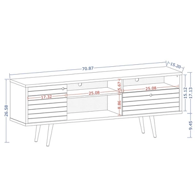The Liberty 70.86 Mid-Century Modern TV Stand is mid-century modern at its best. Quality craftsmanship and careful detailing create the ultimate blend of style, functionality, and brilliant design. A sophisticated entertainment center, the piece features open shelving, as well as two hidden compartments perfect for stashing DVDs, board games, electronics, and media accessories. Free standing and easily moved, this stand will mix well with any decor and its artful grooves will create a statement in any space.