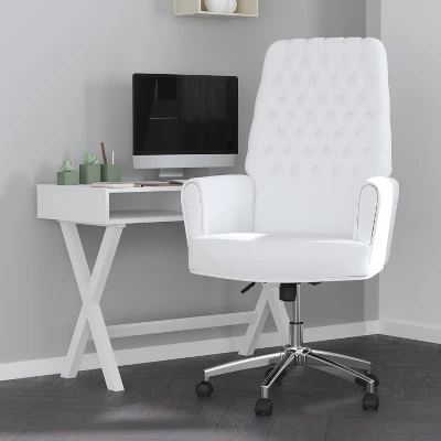 Elegant and stylish, this button tufted executive chair with arms is ideal for your home office. A height adjustable, swivel seat features a tilt lock mechanism and tilt tension adjustment. The heavy duty chrome base is finished with dual wheel casters for convenience. Additional Features: Smooth Gliding Swivel Seat, Chrome Base with Dual Wheel Casters, Item Size: 29″W x 30.5″D x 48-50.5″H; Seat Size: 19″W x 21″D x 18.75-21.5″H; Back Size: 24″W x 30.5″H; Arm Size: 26.5-29″H from floor; 8″H from seat
