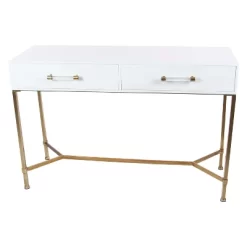 Bring a finishing touch to your home with an inviting appeal with this console table. A sturdy and long lasting construction for a years of enjoyment. Complement this gold and white console table with ceramic abstract sculpture and vibrant potted plants for an updated look. This item ships in 1 carton. White console table features 2 drawers with 15 lbs weight limit. Suitable for indoor use only. Maximum weight limit is 100 lbs. This is a single console table. Glam style.