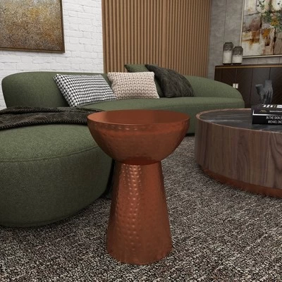 - •Hammered metal accent table sports a glossy copper finish with brass undertone
