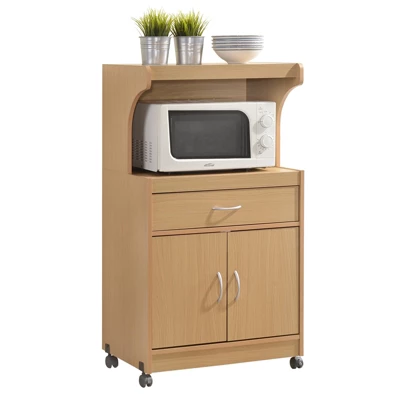 Contemporary and functional, this Hodedah Microwave Cart is the perfect solution for your kitchen storage needs. The large open storage space at the center houses your microwave. The top shelf can be used to store your toaster oven. It has an enclosed cabinet space which provides compact kitchen storage for small kitchen appliances, pots and pans. It features a drawer for utensil storage. This microwave cart features wheels, which allows for easy mobility if necessary. It is made of wood, which ensures strength and durability.Features : Convenient and accessible way to store your microwave, toaster and other small appliancesPerfect coffee station for small kitchens and office spacesDrawer to store kitchen utensilsConstructed of durable engineered wood that will sure to last many years to comeWheels that facilitate movement around your kitchen as well as locking casters for fixed positioningFunctional and attractive with its sleek contemporary stylingAvailable in 6 color options: Beige, Black-Beech, Cherry, Chocolate-Grey, Grey-Oak and WhiteSpecifications : Product Dimensions : 45 in. H x 24 in. W x 15.75 in. DAssembly Required : YesAssembly details : Adult Assembly