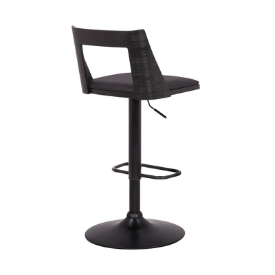 Add some modern flair to your home with the Armen Living Milan Adjustable Swivel Faux leather and Wood Bar Stool with Metal Base. The open back concept provides comfort as well as style and the plush padded and high-density foam seat rests atop a strong pedestal base that creates a sturdy and comfortable seating experience. The adjustable seat height functionality allows you to use this stool at your kitchen island, home bar, or peninsula without having to worry about the surface height. The convenient swivel function optimizes everyday use or entertaining, keeping everyone engaged regardless of their place in the room. Wrapped in luxurious faux leather upholstery and complimented by beautiful walnut wood back, the Milan stool has a mid-century silhouette exudes timeless beauty that will last for many years to come. The Milan stool is available in your choice of Black or Gray faux leather upholstery with black wood and a black metal base.