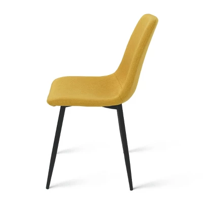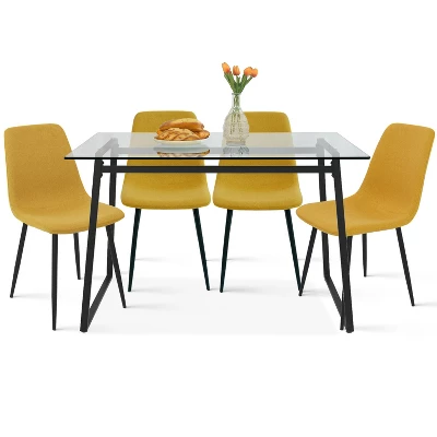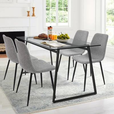 This 5-piece dining set brings visually light, mid-century-inspired style to your dining room or kitchen. It includes a rectangular table and four sleek dining chairs. The tabletop is made from clear tempered glass, and rests on a metal sled base with a black finish. Each chair is made from steel and engineered wood, and upholstered in polyester blend fabric for just the right amount of padding while you relax over dinner or dessert. The chairs have armless scoop-back silhouettes and slender tapered legs. We love that this set resists scratching and staining, so it’s ready for daily use.