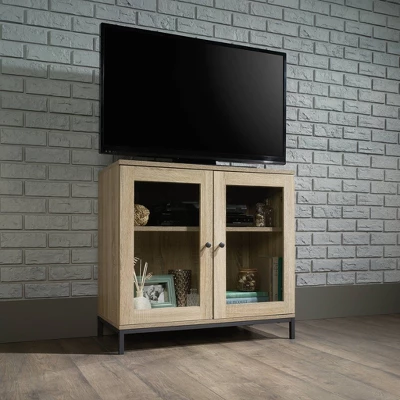 Chic and sophisticated. This display cabinet from the North Avenue collection adds style and function to your home décor. Behind its framed, safety-tempered glass doors is a large adjustable shelf for display of all your most prized possessions. It also accommodates up to a 32” TV to meet all your entertainment needs. Constructed with a durable, black metal base and finished in Charter Oak, this beautiful cabinet is a perfect fit for any room in your home.