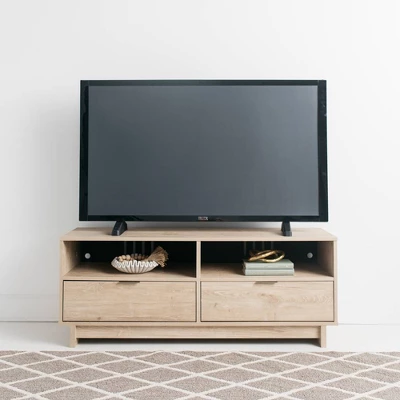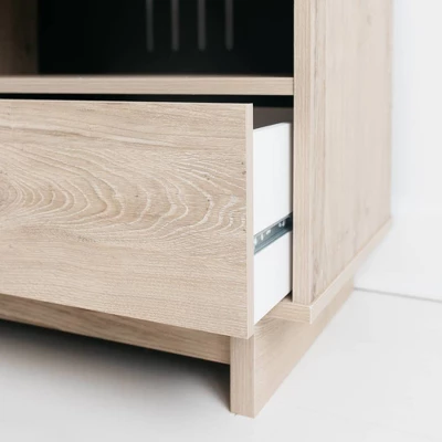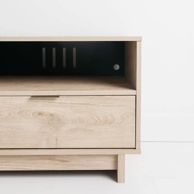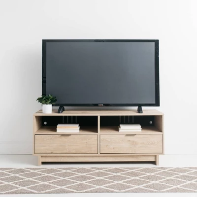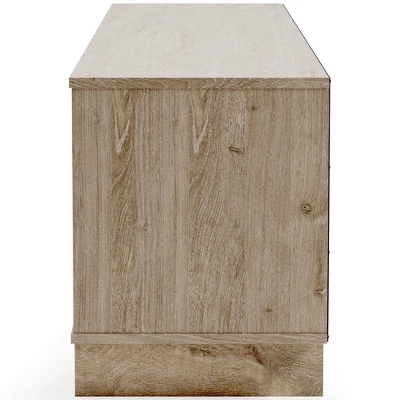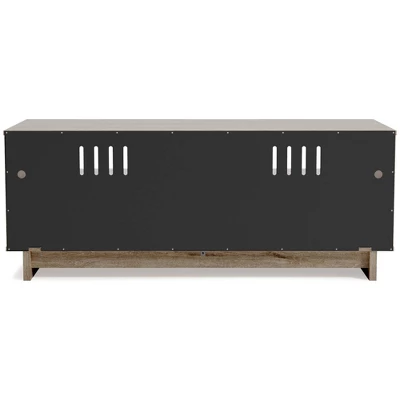 Bringing big style to your living room, this TV stand is a smart, snappy choice for those with an eye for contemporary design. Its clean-lined profile and open shelving create a simple silhouette, with enough space for all your tech and the accessories that come with it. Smooth-gliding drawers with nickel-tone pulls keep this entertainment center on the cutting edge of cool. Signature Design by Ashley is a registered trademark of Ashley Furniture Industries, Inc. ​