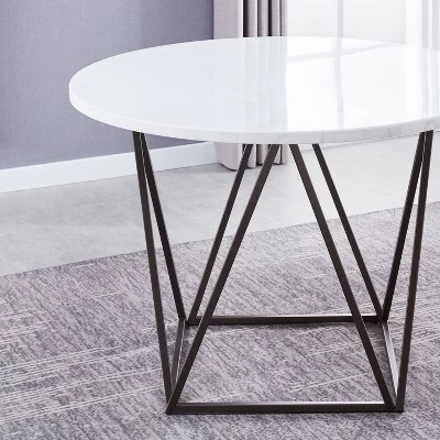 A dining table that is both beautiful and durable, Ramona features mid-century modern styling that will instantly update any dining area. This mixed media table features a round white marble top combined with an architecturally shaped dark bronze metal base. The 44” round table is great for small dining spaces. Your purchase includes one dining table.