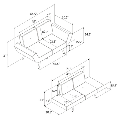 - Product dimensions: Sofa – 64.5”L x 30.5”W x 31”H. Bed – 71”L x 30.5”W x 15.5”H. Weight limit: 400 lbs. Shipping dimensions: 37”L x 31″W x 15”H. Net weight: 59 lbs. Gross weight: 65 lbs.