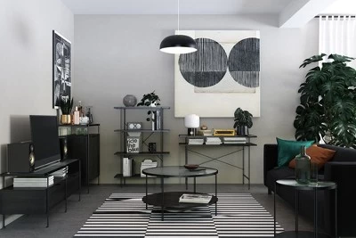 - Made of laminated particleboard, the woodgrain finish pairs with the fluted glass top shelf and sturdy metal frame for a gorgeous statement piece