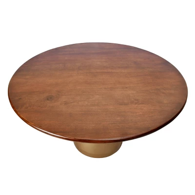 - Mixed materials Marries solid mango wood with a spun metal base in a gold finish