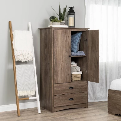 Can’t decide what you’re planning to store in your bedroom? The Salt Spring 2 Door Armoire is versatile enough to accommodate just about anything you choose! Insert the adjustable shelf to keep blankets, sheets and pillows nearby or use the hanging rod to store clothes as well shoes, accessories, or any other everyday items. Two full-size drawers mean this armoire is primed for even more clothing storage. The drifted gray laminate finish adds a rustic touch that will suit any farmhouse or coastal decor scheme while the black metal hooded handles and matte black knobs add a vintage feel. Coordinate it with other space-saving pieces from the Salt Spring Bedroom Collection!