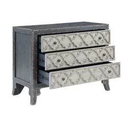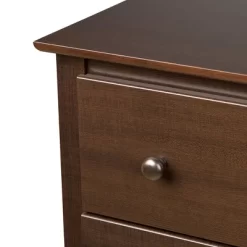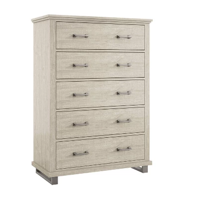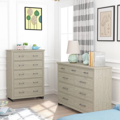 This bedroom set is comprised of two pieces: a spacious chest with five drawers and a dresser with nine drawers. Each drawer smoothly glides open on metal ball-bearing glides, allowing you easy access to your clothes and accessories. The drawers are roomy enough to store and organize all your needs, including clothes, linens, and more. The classic beige color, complemented by wood grain handles, adds a touch of elegance that seamlessly blends with any decor.