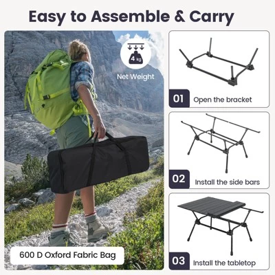 - Hassle-free Installation: All necessary parts and detailed instructions are included for easy assembly without any installation tools. Simply extend out the frame and fit the support legs, fit the 2 side bars and unroll the tabletop to secure it in place, then adjust the height to the desired position, and a portable picnic table is ready to use.