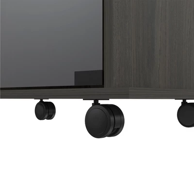 Entertain your friends and guests in style with the TUHOME Dukat Wine and Liquor Bar Storage Cabinet Cart. The Dukat bar cart is designed with multiple shelves and storage cubbies, allowing you to store and showcase your favorite bottles of wine and liquor. When you invite company over, there’s no need to rush to the kitchen to refresh your friends’ drinks: you can conveniently top them off with a quick spritz from this bottle cart. With a spacious top shelf, preparing and serving drinks has never been easier.For more convenience, 6 cubbies located on the side of the cart let you elegantly store wine bottles or liquor bottles. Underneath the main shelf, 2 additional shelves are enclosed by a glass door, providing the opportunity to store glassware, bar tools, and more bottles of your choice. Add a modern touch to any room and design your own display to showcase your alcohol selection. This portable bar cart also features a locking mechanism to keep the cart secure while also allowing maneuverability when you need it. Create your own bar at home, with the Dukat Wine and Liquor Bar Storage Cabinet Cart by TUHOME.